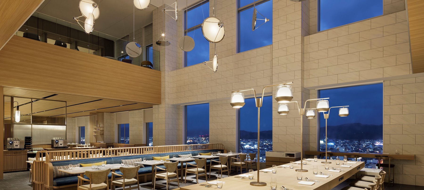 光が差し込む大きな窓からは福井の町並みや日本百名山の荒島岳や白山がを望むことができ、種類豊富な朝食からランチ・ディナーまで、多彩なメニューをご用意しております。